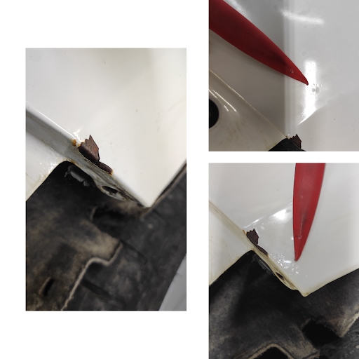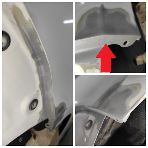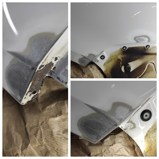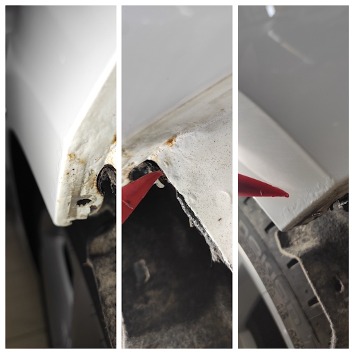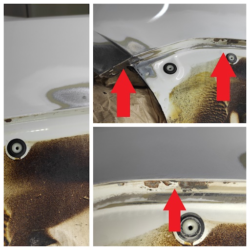 Как видите на фото, коррозия пошла намного дальше вспучивания краски и на месте стыка повреждения намного сильнее, чем на видных местах. Кроме того, повреждено крепление, следовательно, внутренняя часть крыла также подлежит осмотру, для выявления масштаба поражения металла.