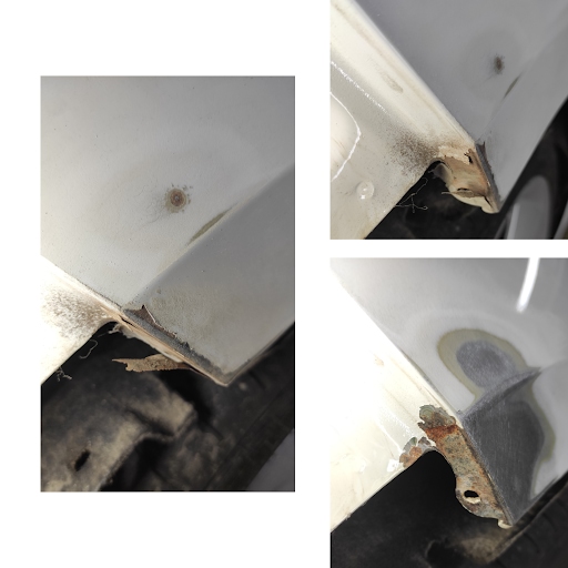 В указанном случае специалисты из отдела кузовного ремонта обрабатывали оголенные металлические участки с помощью кислотного грунта. Применение кислотного грунта на металлической поверхности способствует формированию защитной пленки, которая эффективно предотвращает повторное появление коррозии.