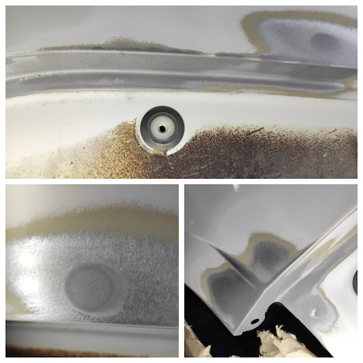 После выявления всех очагов коррозии подготовщик приступает к устранению ржавчины. На данной машине первоначально проведена шлифовка с применением грубого абразива. Это позволило убрать дефектный слой краски и слои ржавчины, образовавшиеся под ним.