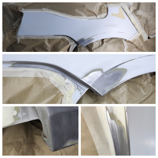 Завершив пескоструйную обработку, наши сотрудники кузовного цеха подготовили детали автомобиля к грунтованию. Все места, где прибегали к грубой шлифовке и обработке металла песком, в обязательном порядке зашлифовываются повторно, но с применением тонких абразивов. Это обеспечивает плавные переходы в местах ремонта детали.