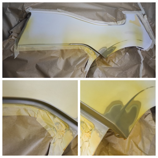 После того как кислотный грунт высох, мастер малярного цеха уложил грунт-наполнитель на поверхность крыла, а также на соответствующие места кузова, где требовался ремонт. Этот грунт призван выровнять поверхность и подготовить ее к следующим работам.