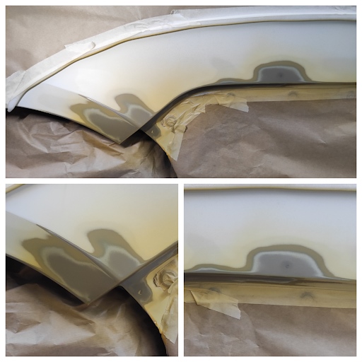 Заднее левое крыло имеет вспучивание краски как по кромке задней арки, так и в районе контакта заднего крыла с бампером автомобиля. Отслоения краски отсутствуют, трещин слоя ЛКП нет, но все очаги поражения будут видны только после удаления краски.